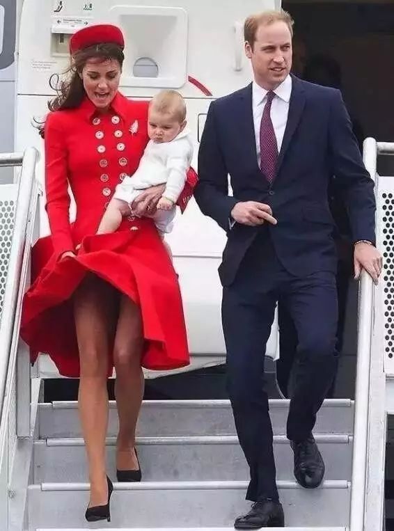 凯特王妃走下飞机的那一刻,忽然刮起一阵大风,差一点就走光了