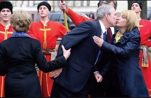 美国前总统布什到访乌克兰时,在欢迎仪式上“强吻”乌克兰总统尤先科的夫人,劳拉往回拽都没拽动。