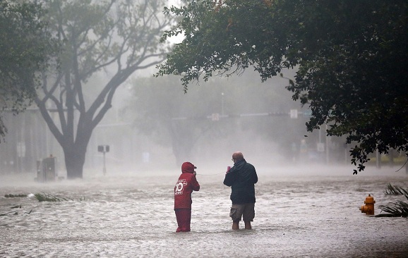 9月10日,两位电视台新闻工作者站在迈阿密一处街道的洪水中。
