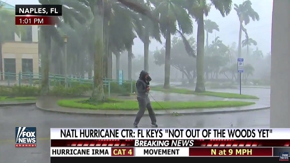 天气频道另外一位气象学家Mike Bettes 9月10日在那不勒斯艾尔玛风眼墙附近做现场报道,他努力支撑着身体不被风吹走。