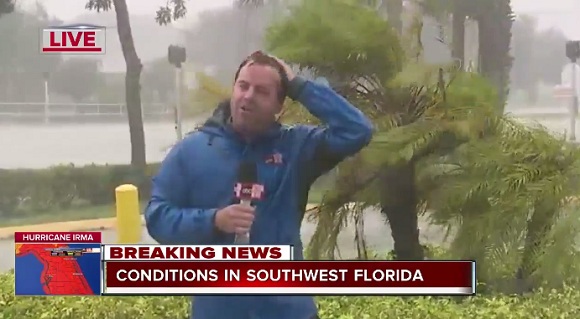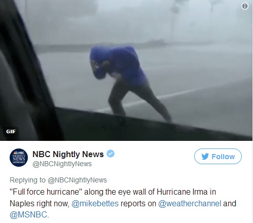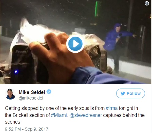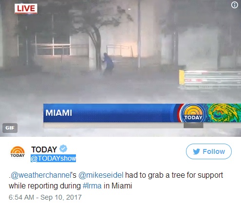 天气频道(Weather Channel)的气象学家Mike Seidel在迈阿密现场报道艾尔玛飓风来袭的情况,视频中,他被大风吹得几乎无法前行。