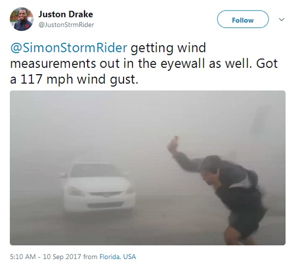 还有天气频道的气象学家Simon Brewer,在风眼中心顶着每小时117英里的狂风在测风速。