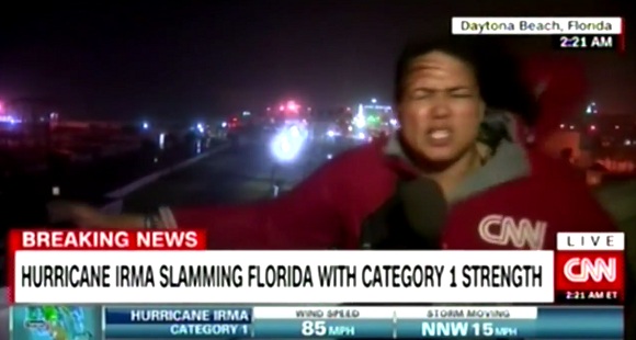 9月11日 CNN记者Sara Sidner在佛罗里达Daytona海滩做现场报道,大风吹得她几乎站立不住,一度也无法说话。