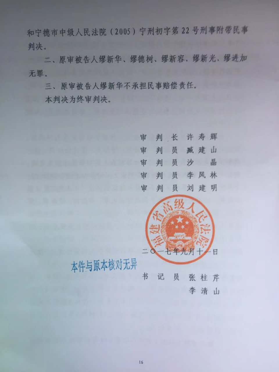 2017年9月12日上午,福建省高级人民法院在南平市建阳区人民法院开庭宣判,再审改判原审被告人缪新华、缪新容、缪新光、缪德树(已于2016年6月13日因病离世)、缪进加等五人无罪,缪新华被当庭释放。