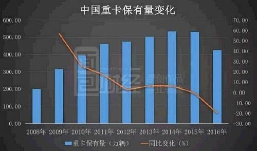 2014年重卡保有量达到历史峰值的533.67万辆,2015年出现历史上首次下降,小幅下滑到530万辆。进入2016年,保有量呈现断崖式下跌,仅为424万辆,比2014年的峰值下跌了21%。