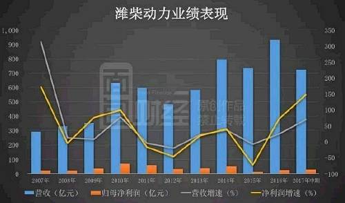 重卡与工程机械行业复苏,让潍柴动力上半年业绩爆棚。2017年上半年,公司实现营收723.13 亿元,同比增长69.9%;归母净利润26.5亿元,同比增长147.4%。以下为公司营收及净利润变化趋势图: