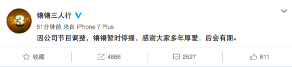 9月12日中午,《锵锵三人行》通过其官方微博宣布节目暂时停播,理由是“公司节目调整”,感谢了观众的厚爱并表示“后会有期”。