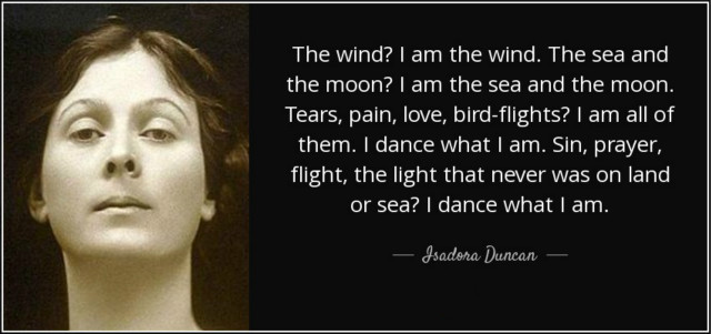 伊莎多拉的一生复杂而充满悲剧性,作为一位富有实践精神的理想主义者,她将自己对现代舞蹈、女性地位和人类自由的思考都转变为了行动,以整个生命对抗攻击和指责。在走向夺走她生命的汽车时,伊莎多拉留给世界的最后一句话恰好是:“我走向荣光!”