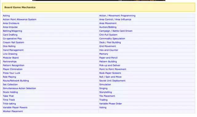 根据权威桌游网站BGG的统计,桌游目前约有51种玩法机制,每年还会根据已有的机制重新组合交叉甚至是轻微的变体。一般来说,一款游戏会包括4-5种不同的机制。而根据不同的标准又可以有众多不同的分类,以最简单的产品形态来划分就可以分为骰子游戏 、卡牌游戏 、图板游戏,以及模型战棋。
