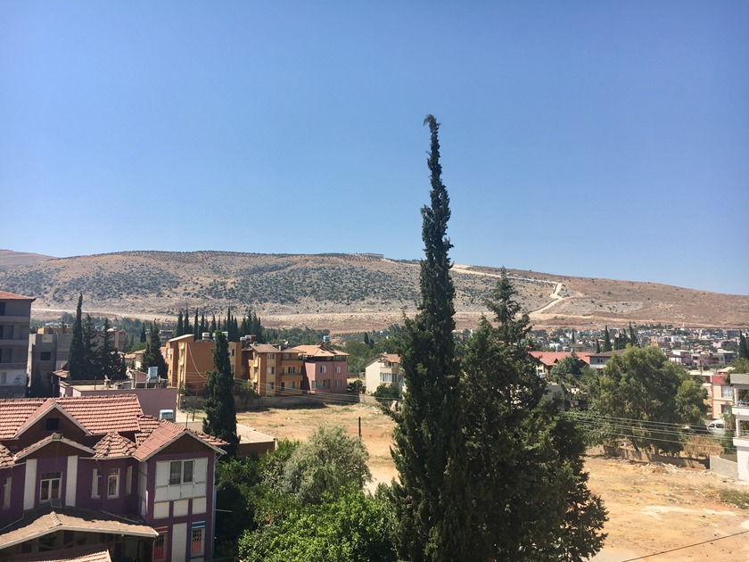我们住的旅馆距离边境不到2公里,从床头的窗向外望去就是叙利亚,土叙之间的高墙在半山腰清晰可见。旅馆中有一个花园可供客人们聊天休息,满架葡萄在我们刚到时还是绿油油酸溜溜的,另一侧的餐桌紧邻花圃里的一片罗勒(ريحان),正合小镇的阿拉伯语名字雷伊汉勒(الريحانية),那也是我们最喜欢的位置,每次用手轻抚这片开着纯白小花的嫩绿罗勒,都能留下满手余香,沁人心脾。