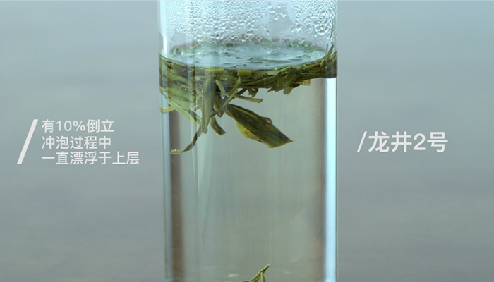 ▲ 这款龙井茶,在冲泡过程中,一直漂浮于上层。经我们肉眼观测,1.5min后,逐渐有20%茶叶出现倒立现象。