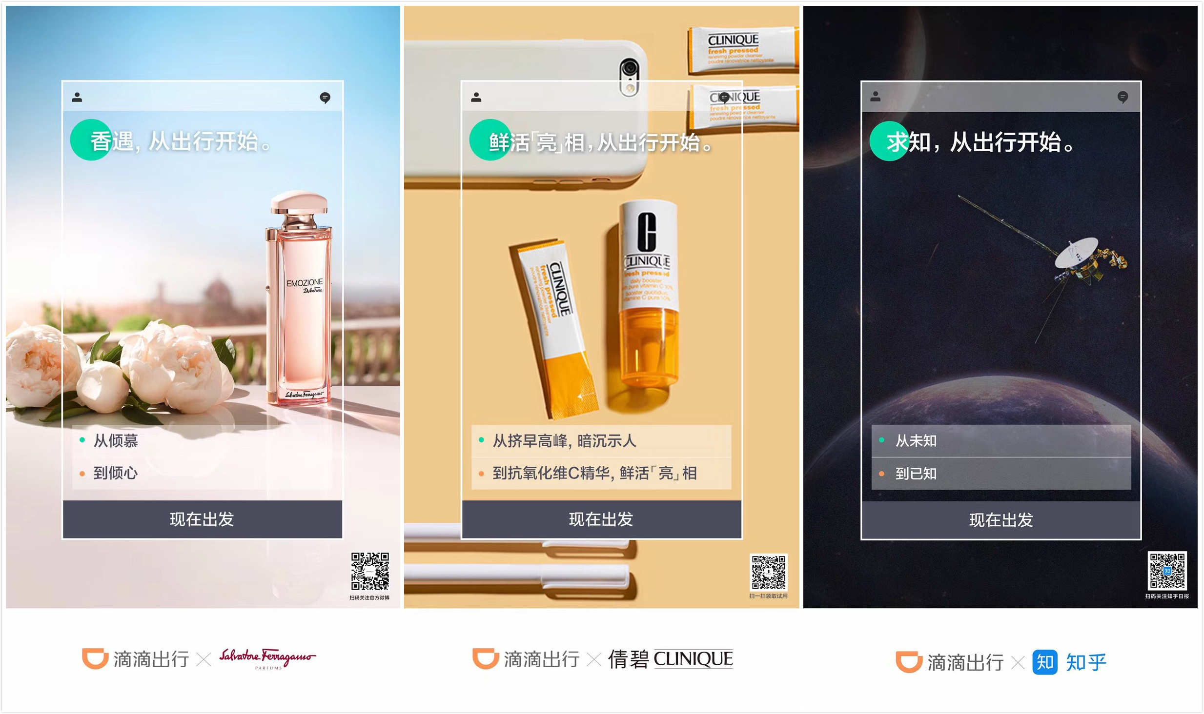“我就喜欢,从出行开始”“饿了就要,从出行开始”“理想生活,从出行开始”……这些混搭风的slogan出自滴滴和26个品牌的合作,包括QQ音乐、亚马逊、I Do、天猫、ofo小黄车、麦当劳、倩碧、可口可乐、知乎、壹基金等等。吃喝玩乐加上出行,不难发现,滴滴想要用这种场景化的营销,带来一种全方位生活方式平台的印象。