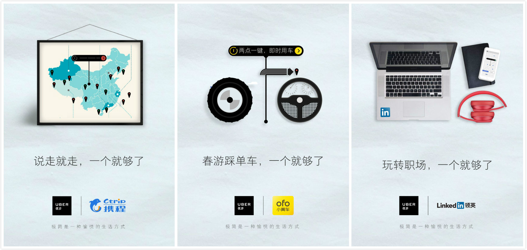 实际上不可否认的是,品牌之间的营销套路总是在相互借鉴。滴滴和优步合并以后,两家公司的品牌营销方式都有了很大的变化。它们不再针锋相对。而过去在营销创意上堪称“教科书”级别的优步,如今也显得相当低调,除了变得“不优步”,它的营销创意似乎也在和滴滴靠拢。比如在今年4月,为了凸显存在感,优步也联合了包括携程、领英、豌豆荚、荔枝FM的8个品牌,强调“一个就够了”。