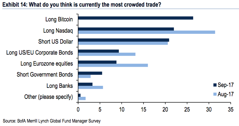 在美银美林(Bank of America Merrill Lynch)每月发布的全球基金经理调查报告中,有26%的人都认为,本月最拥挤的交易是做多比特币。这意味着,投资者/投机者正在扎堆抢购比特币。