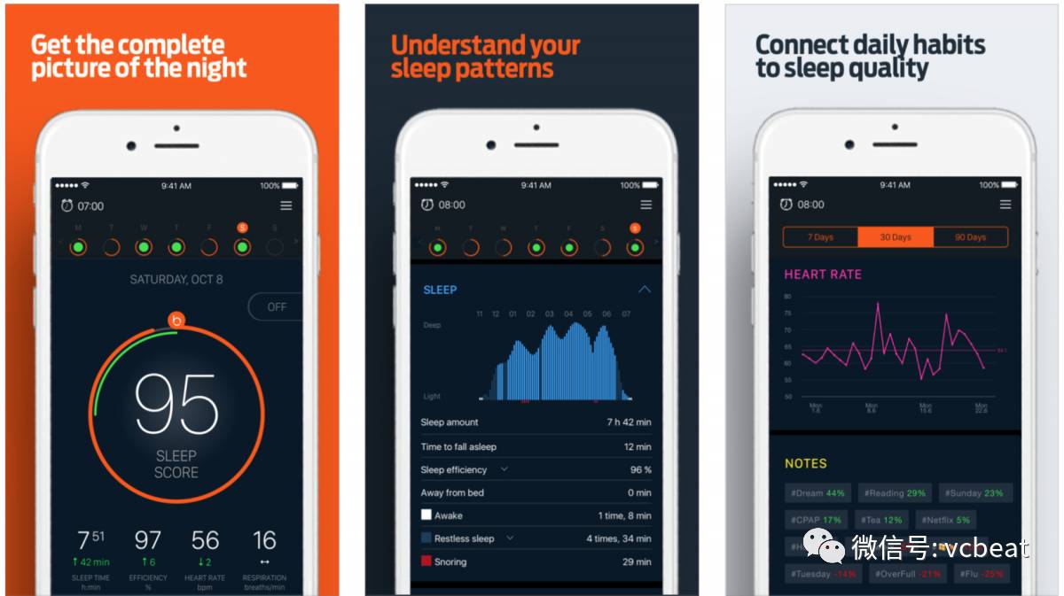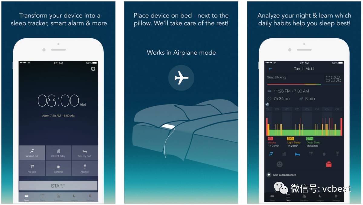 这款应用鼓励用户追踪他们生活中的其他部分,比如运动和饮食,然后分析这些因素如何影响他们的睡眠,并与苹果手机自带的健康应用结合对比,以促进睡眠。