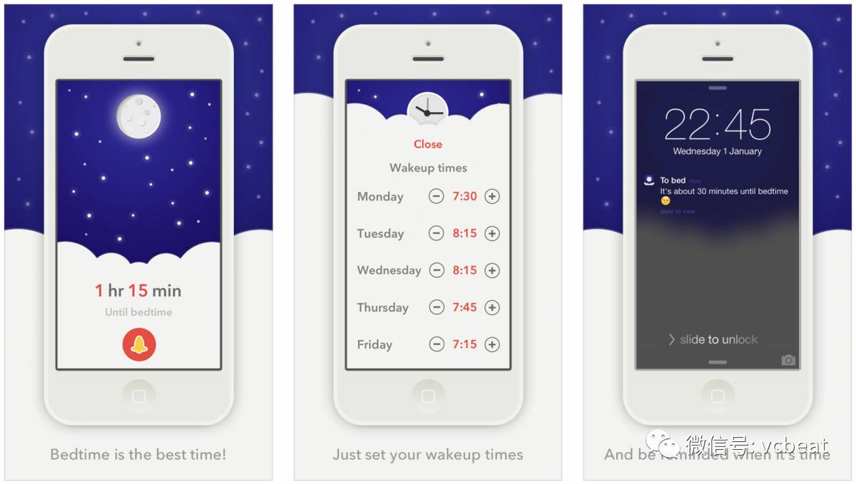 用户只需在应用中设置年龄,以及他们想要何时醒来,To bed就会提醒人们什么时候该上床睡觉。且这款应用程序自动设置在周末不发出提醒,也可以设定为被日常安排中的假期或其他休息时间。