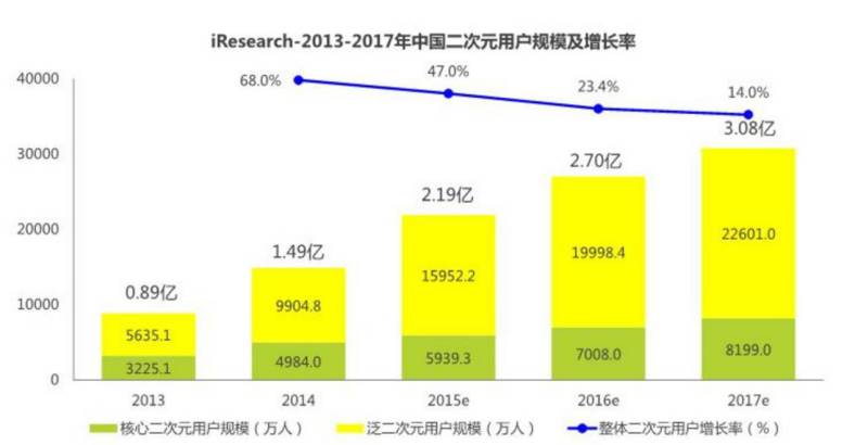 与之相对的是二次元人群的急速增长,据统计,2013年至2016年三年间我国泛二次元用户数量增加了三倍,2017年预计将达到3.08亿人。