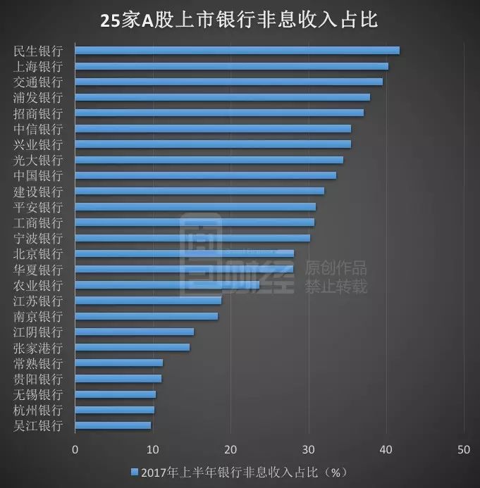 今年上半年,上海银行非利息净收入达到61.88亿元,同比增长51.37%;非息收入占比也达到40.2%,在所有上市银行中位居第二,在城商行中位居首位。下图为面包财经根据财报绘制的已公布(截至8月28日)A股上市银行非息收入占比: