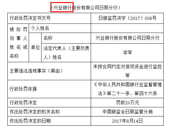 兴业银行最近应该是水逆期。9月11日,中国银监会网站公布了对兴业银行日照分行的处罚信息。