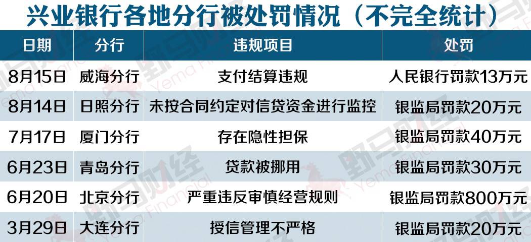自2017年3月以来,兴业银行大连分行、北京分行、青岛分行、威海分行等分支机构分别由于授信管理不严格、严重违反审慎经营规则、贷款被挪用、支付结算违规等原因被各地银监局和人民银行进行处罚,累计罚款金额近1000万元。