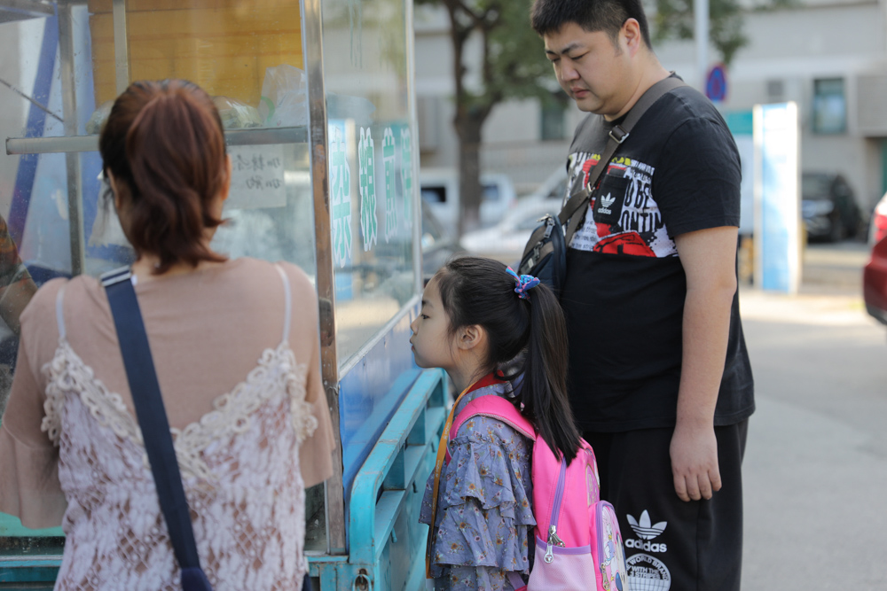 小姑娘刚上一年级,老师要求提前去学校适应一天,她爸爸带着她来买煎饼,买完就站在路边吃了,没吃两口吧嗒掉了半个,就又过去买了一个。