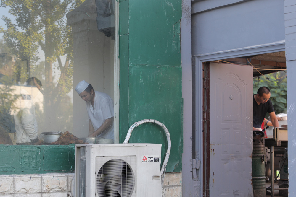 8月29日,8:34 老板说北京近一半的清真早点铺都是山东德州人开的,他跟饺子馆的人就是一个村的,他们把早点摊支在了馆子外。