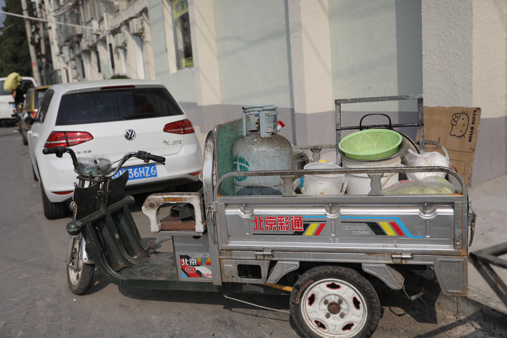 8月30日 8:30 这个电动车再加个推车就是他们铺子的全部,热心大爷要帮他们直到收摊。