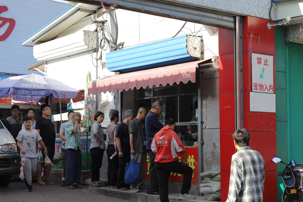 8月29日 7:28 北京的大爷大妈们带着泰迪来买早点,有的坐在里面等着主人吃完,有的只能在门口眼巴巴望着等。