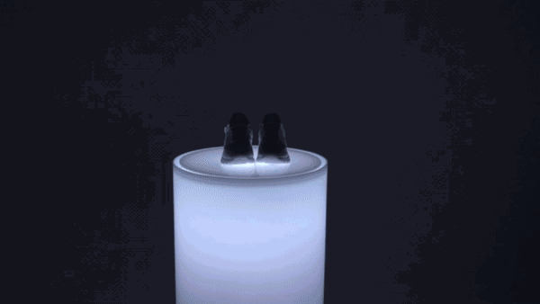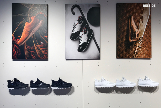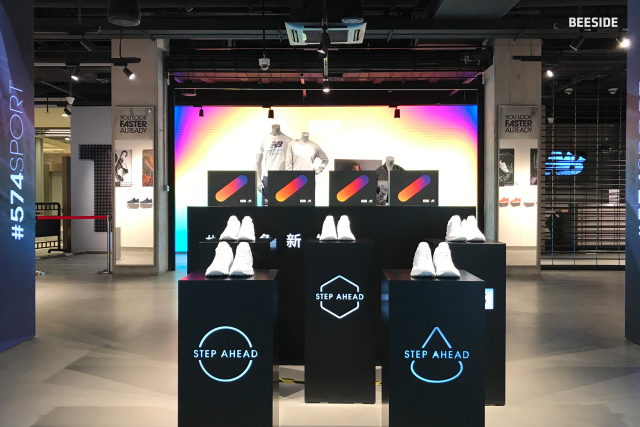 在一个封闭的白色球形空间内,陈列着圆柱形的白色灯箱,上面摆放了一双最新的白色款 574S。颇有艺术展览的气息(虽然只有那么一个)。
