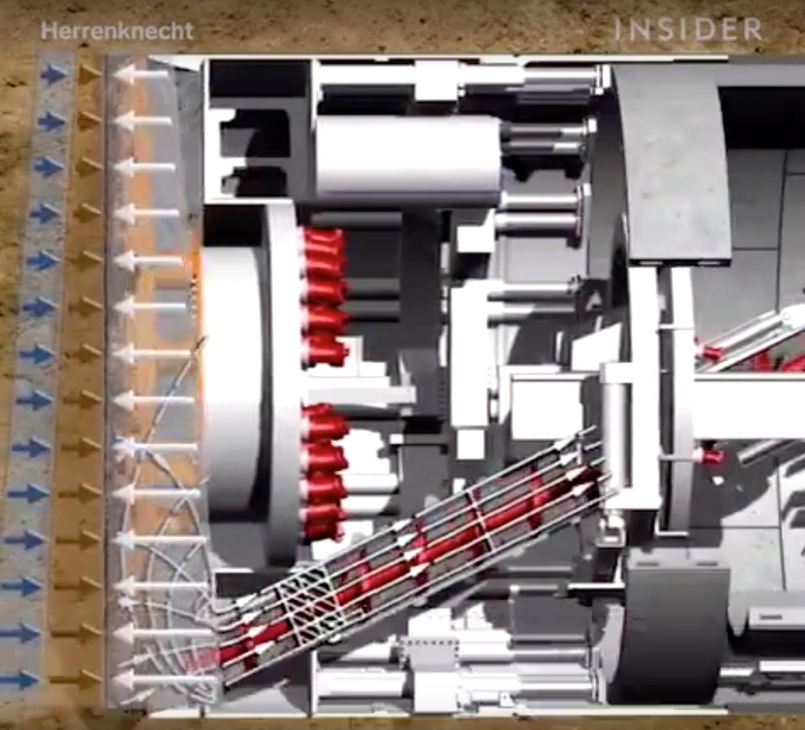 在盾构机的36个工作空间内,每一个空间靠着钻挖方向的泥土有一块可移动的门板,一名工人将门板移开后将前面一定量的泥土挖走再将门板用工具固定,当盾构机前方的泥土已经被挖走,工人就转动螺丝令盾构机往更深处推移,盾构机上的工人一面挖走泥土,另一批工人就不停在背后敷设砖墙。钻挖的进度非常缓慢,隧道每周推进约3-4米。