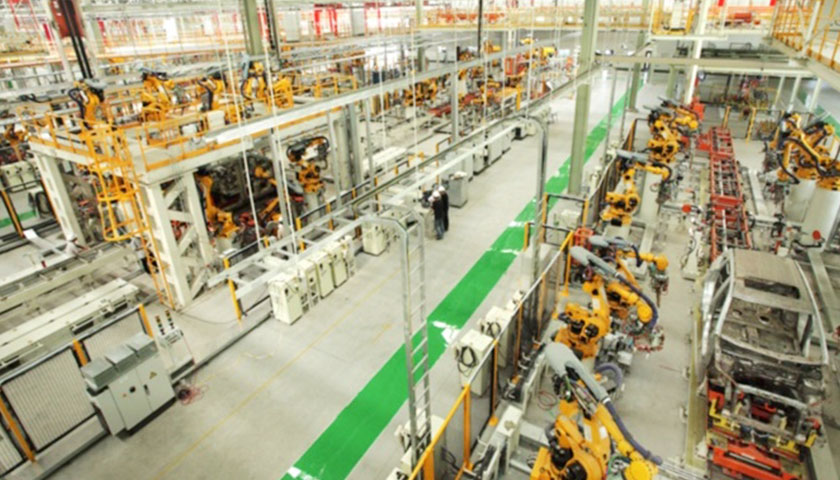 焊装车间用于点焊、涂胶、搬运、螺柱焊等工艺过程。其中,主拼工位密集布置10台机器人,顶盖工位由7轴机器人完成顶盖抓举动作。高速随行夹具的采用,可实现高度柔性化生产,生产线由德国爱达克(GEOTACK)全力打造,更配置了108台日本进口Nachi工业机器人,整个车间达到高度自动化。
