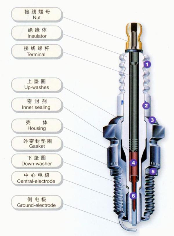 火花塞顾名思义,是产生火花的零件。简单而言便是,发动机需要通过燃烧油气混合物来产生动力,而产生火花来点燃油气混合物的零件,就是火花塞。上图便是火花塞的结构图,图中我们可以看到,小小火花塞的结构可谓复杂和精密,火花塞最关键部位的是两个电极以及两极间的间隙。