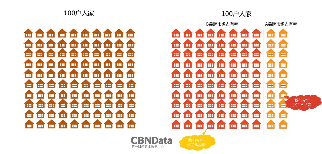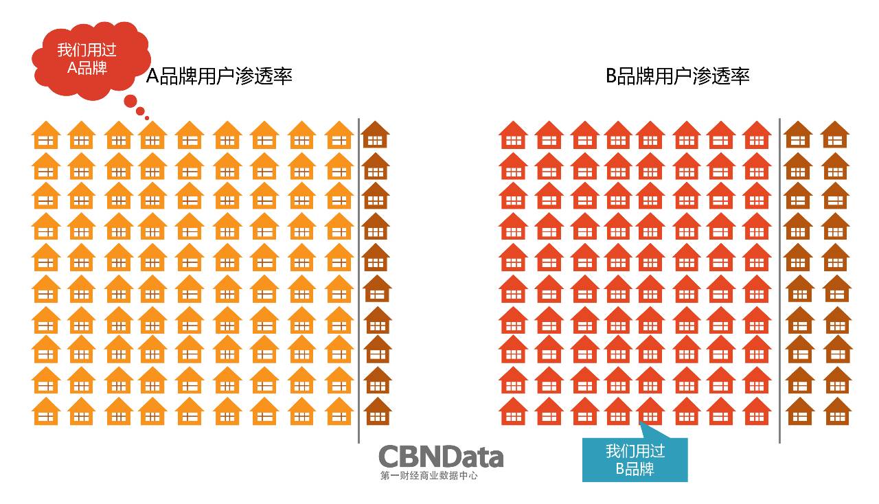 举个例子,以100户家庭为总样本,在过去的10年里共有90户家庭购买过A品牌的产品,有80户家庭购买过B品牌的产品,则A品牌的客户渗透率为90%,B品牌的客户渗透率为80%。而在某一年,100户家庭中只有20户购买了A品牌,而其他80户家庭购买了B品牌,则A品牌当年的市场占有率为20%,B品牌当年的市场占有率为80%。