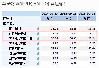 强大的营运能力,花着别人的钱来赚自己的钱。作为一家供应链全球化的科技公司,苹果的存货周转天数逆天的达到了6天!应收账款周转天数也就1个月内。2016年的预付账款天数在101天。也就是说苹果31天内就完成了一轮完整的销售行为,但是苹果偏偏要100天左右才给供应商结算款项。