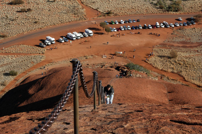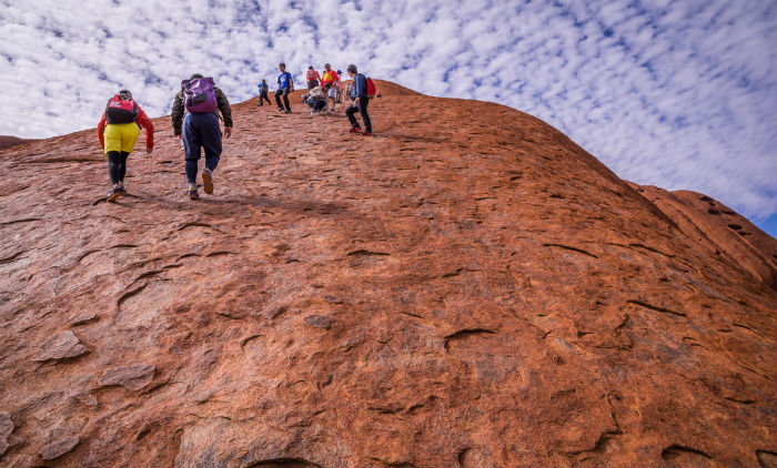 首先,如果从旅游行为的基本原则——遵守当地法律法规的角度来说,攀爬乌鲁鲁巨岩的确是合法的,这项活动的历史始于五十多年前:虽然乌鲁鲁大石头在1873年就已被探险者发现,但针对它的旅游开发从20世纪40年代后才开始。1964年,一组铁链被安装在陡峭的岩壁上,以便游客在攀爬中可以借力;之后在1976年,铁链又被进一步加长。1985年,澳大利亚政府正式将这片土地的所有权还给当地原住民阿南古人(Anangu),再由他们将国家公园租借给政府,为期99年。