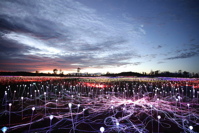 即便不爬到乌鲁鲁大石头的顶上,这里如今也有另一种平日无法看到的风景,前提是,你要在公园里待到入夜:艺术家Bruce Munro创作的震撼人心的艺术装置展“乌鲁鲁原野星光展”,在红土沙漠上放置了5000余个特制的光球,每当夜幕降临后便会绽放出星星点点的美丽光芒,仿佛从荒漠深处升起繁星。由于极受欢迎,原定于今年关闭的展览被延迟开放到2018年3月。