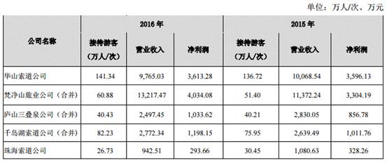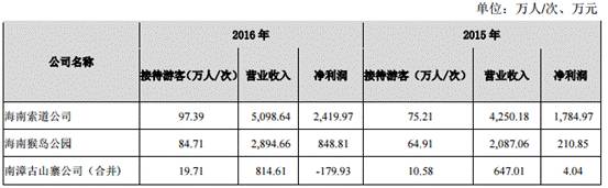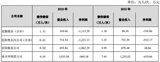 而作为新景区、新索道,海南索道、猴岛公园在2016年收入、净利润显著增长,主要原因是2016年为农历“猴年”因素影响,海南猴岛公园和索道客流量迎来增长高峰,2016年游客人数较2015年增加30%;而还处于建设期和市场培育期的崇阳、内蒙古克什克腾旗项目则持续亏损,详见下方数据: