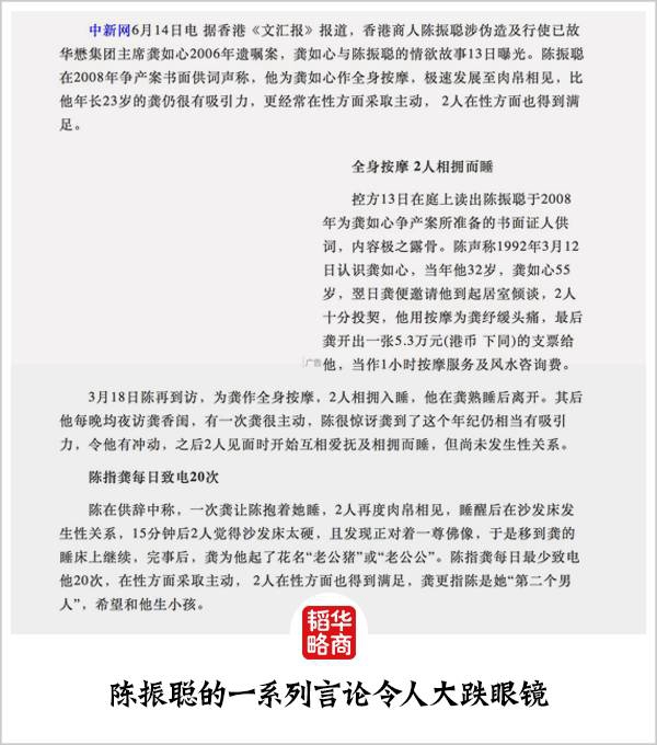而且,陈振聪还加倍发挥了自己的天赋,知道普罗大众想听什么。在法院供词和媒体面前,他不断拿出香艳露骨、骇人听闻的故事和细节,即便不少故事被坐实为胡编乱造,但这些新闻得到了广泛传播,几乎全香港都知道了龚如心在生前有这么一位“恋人”,还拿到了“合法”的遗嘱。