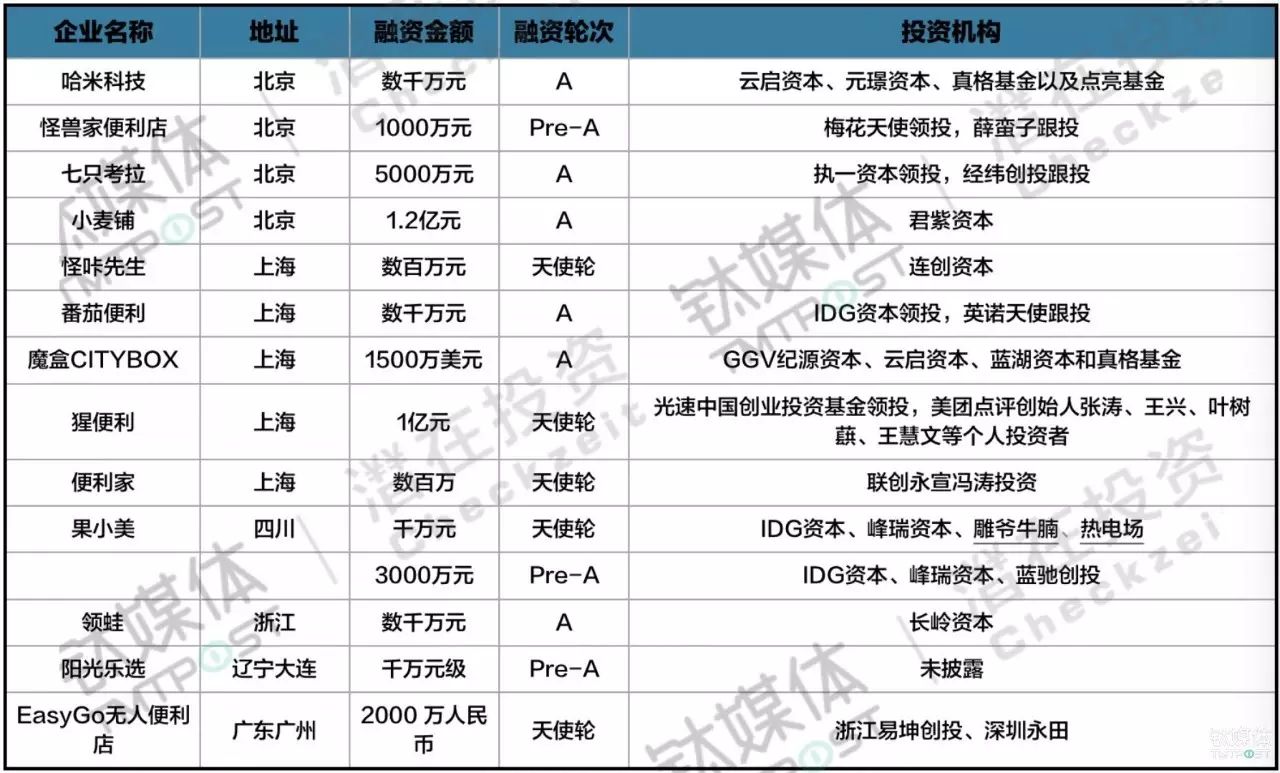 其中,果小美成立三个月融资金额超过1亿人民币;近日刚入场的猩便利,天使轮就拿到了超亿元人民币,而在投资方名单里,不仅有一线投资机构,还能看到美团点评创始人张涛、王兴、叶树蕻、王慧文等人的身影。