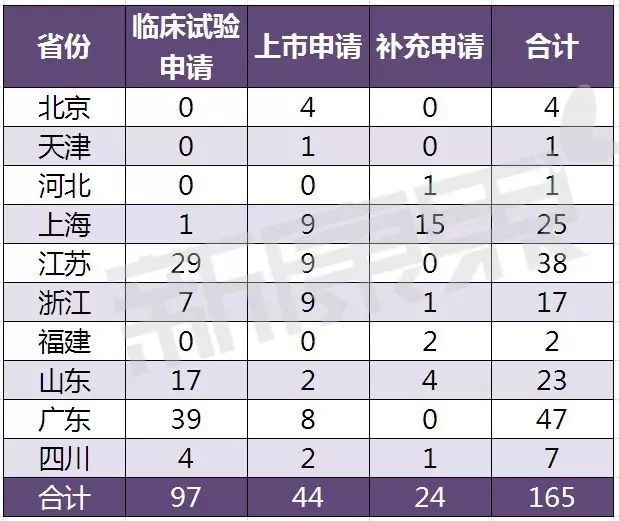 2017年1月6日,CFDA统计并发布了截至2016年12月25日各试点省份药品上市许可持有人试点品种申报情况。整体受理号数据方面,广东数量最多,高达47个,有39个为临床试验申请。单看上市申请方面,上海、江苏和浙江并列第一,均为9个;补充申请方面,上海最多,为15个。