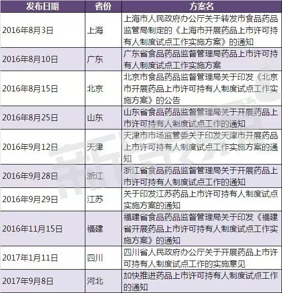 ·2016年6月6日,国务院办公厅印发《药品上市许可持有人制度试点方案》,对开展药品上市许可持有人制度试点工作作出部署。在北京、天津、河北、上海、江苏、浙江、福建、山东、广东、四川等10省(市)开展试点工作。《方案》自印发之日起,实施至2018年11月4日。试点行政区域内的药品生产企业参照本方案中持有人的有关规定执行。