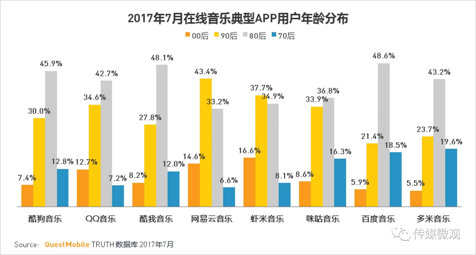 百度因为版权问题日趋式微,留在赛场上的都是资本玩家,TME与阿里音乐手握独家版权,背后有大文娱生态,网易云音乐能与之抗衡的只有用户。据QuestMobile发布的2017在线音乐应用行业洞察报告,网易云音乐00后和90后用户占比接近60%,远高于TME三家以80后为核心用户的音乐APP,可以预见,网易云音乐在内容衍生和未来增长具备无限可能性。