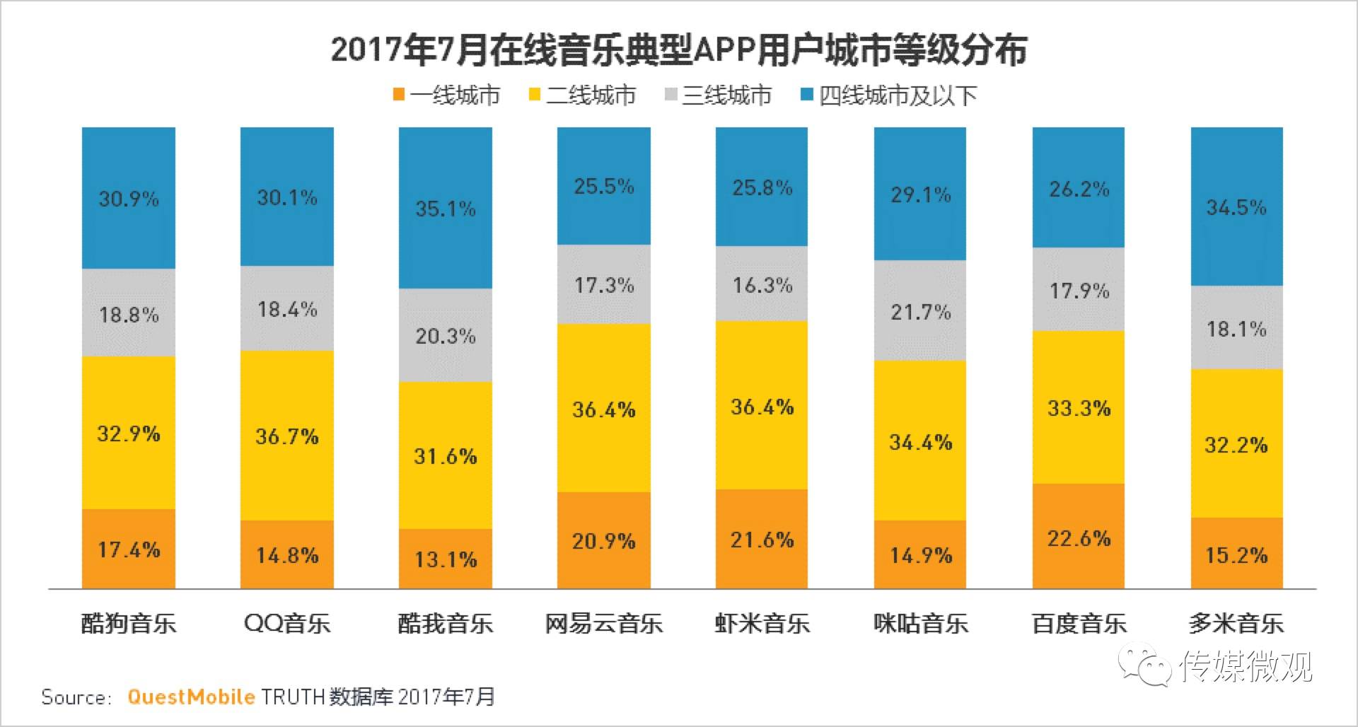 ▲相比之下,网易云音乐用户一、二线城市集中度最高,用户审美能力与社交影响力优势明显。目前其他音乐APP难以从口碑传播上再次对其形成狙击。