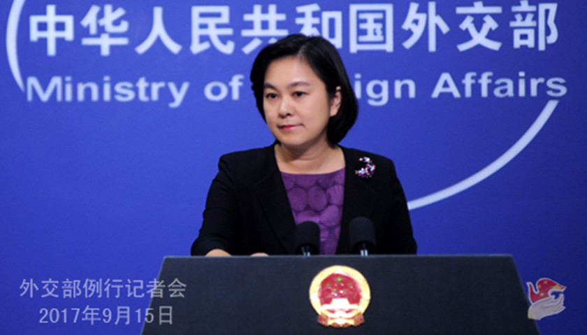 2017年9月15日外交部发言人华春莹主持例行记者会,在回答有关朝鲜再次试射导弹的问题时华春莹表示,中方反对朝鲜违反安理会决议有关规定,利用弹道导弹技术进行发射活动。当前半岛形势复杂、敏感、严峻,有关各方都应保持克制,不做加剧半岛和地区局势紧张的事。