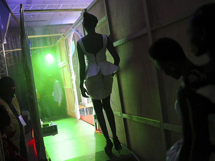 Festi'Bazin时装发布会上,一模特等待走上T台。