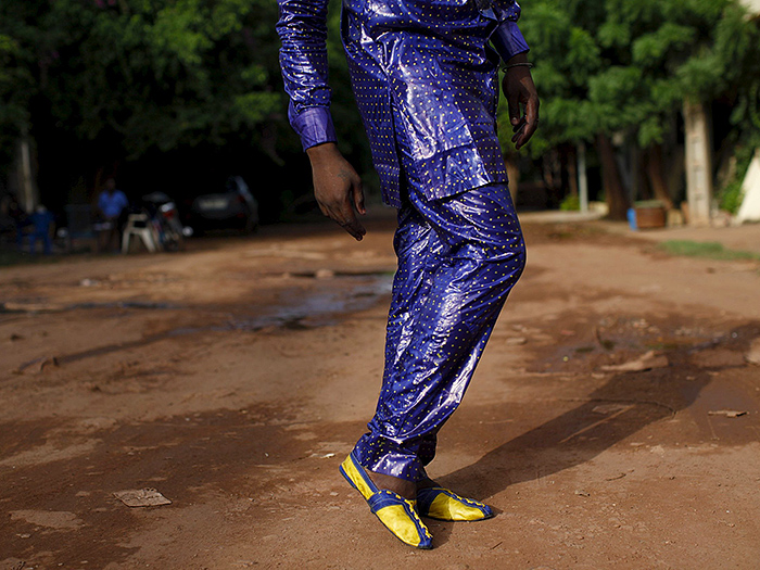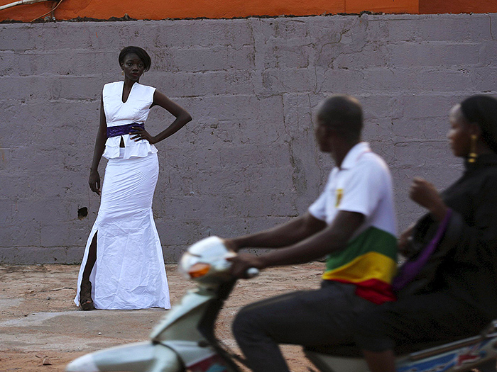 在马里首都巴马科,一年一度的以“Bazin”为主角的时装秀及交易会举行,模特们伴随着西非原创音乐走秀、拍照。“Bazin”,是一种精美的全棉提花布料,这种抛光面的厚棉布料有着独特的光泽,在这一地区十分流行,马里人出席正式场合几乎都会穿着此种布料制成的服饰。“如果你参加婚礼的时候没有穿Bazin,那你就不用去了。”Bazin西装设计师 Baba Sereme如是道。图片来源:视觉中国