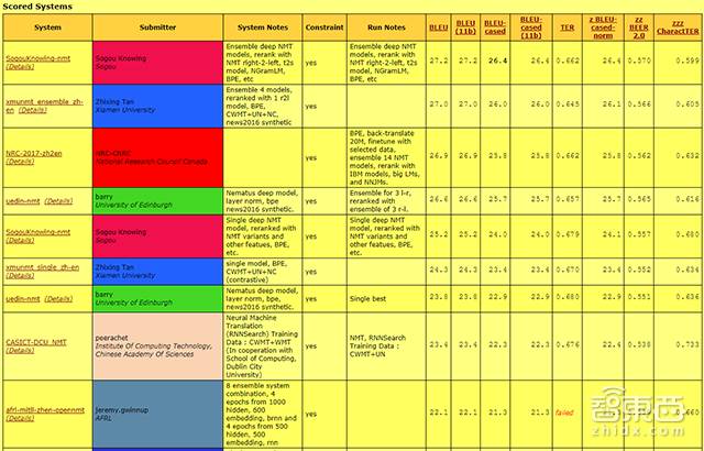 (WMT机器翻译比赛得分表,第一个即为搜狗团队的机器翻译系统)