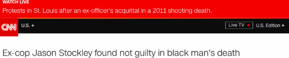 【警察射杀黑人未获罪 圣路易斯爆发抗议抵制法官判决】在法官以证据不足为由判定前警官杰森·斯托克利(Jason Stockley)2011年12月杀害黑人男子安东尼·史密斯(Anthony Lamar Smith)的一级谋杀罪不成立后,美国密苏里州圣路易斯市中心爆发抗议活动,示威者在当地法院外表达不满,高呼“不公正就没有和平”的口号。四名警察受到攻击,其中一人受伤,抗议者中有13人被捕。