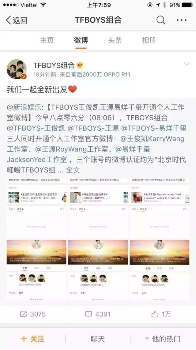 今日早间,TFBOYS组合成员王俊凯、王源、易烊千玺三人同时开通个人工作室官方微博:王俊凯KarryWang工作室、王源RoyWang工作室、易烊千玺JacksonYee工作室。三个账号的微博认证均为“北京时代峰峻TFBOYS组合个人工作室官方微博”。