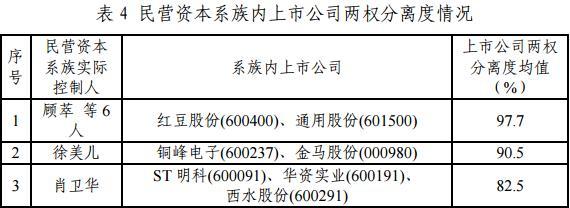 从表4中可以看到,本报告所梳理的76个民营资本系族中,有25个系族内上市公司两权分离度均值超过50%,占比约为33%;在179家民营资本系族控制的上市公司中,有62家上市公司的两权分离度高于50%。